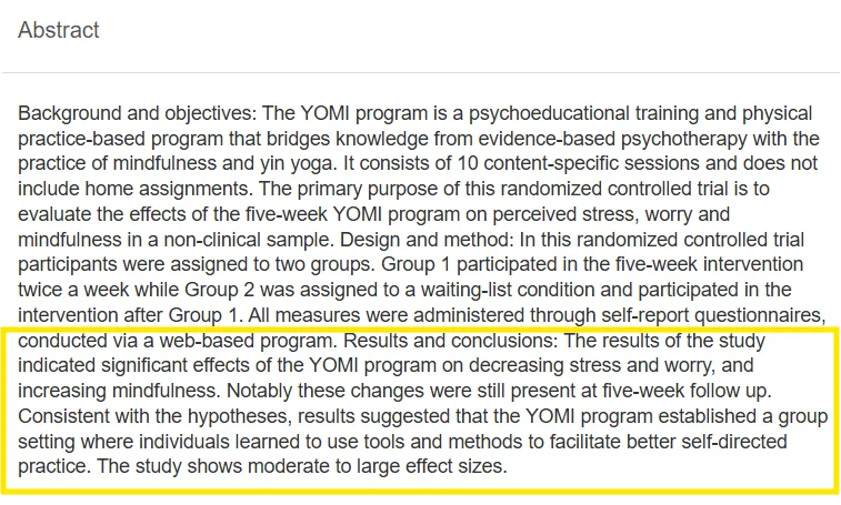 3. يين يوغا واليقظة الذهنية: دراسة عشوائية مضبوطة لمدة خمسة أسابيع لتقييم آثار برنامج YOMI على التوتر والقلق؛; https://www.researchgate.net/publication/314851680_Yin_yoga_and_mindfulness_a_five_week_randomized_controlled_study_evaluating_the_effects_of_the_YOMI_program_on_stress_and_worry