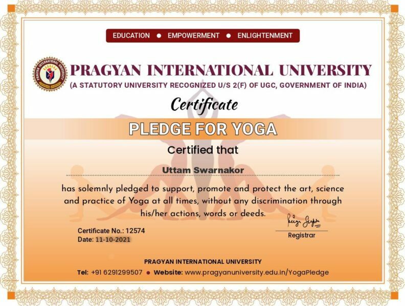 Participou e se comprometeu no programa de treinamento de ioga da Pragyan International University em Jharkhand, na Índia, em 2021.