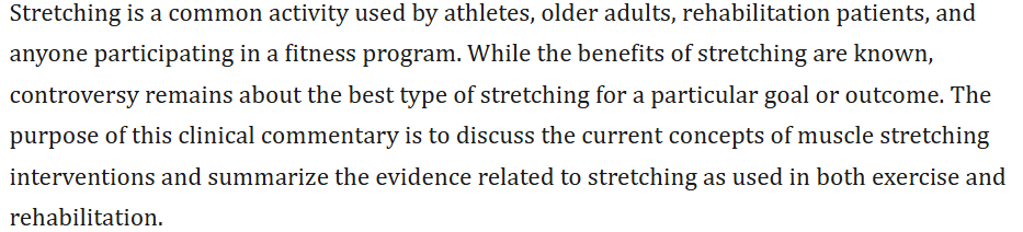 - CURRENT CONCEPTS IN MUSCLE STRETCHING FOR EXERCISE AND REHABILITATION; https://pmc.ncbi.nlm.nih.gov/articles/PMC3273886/